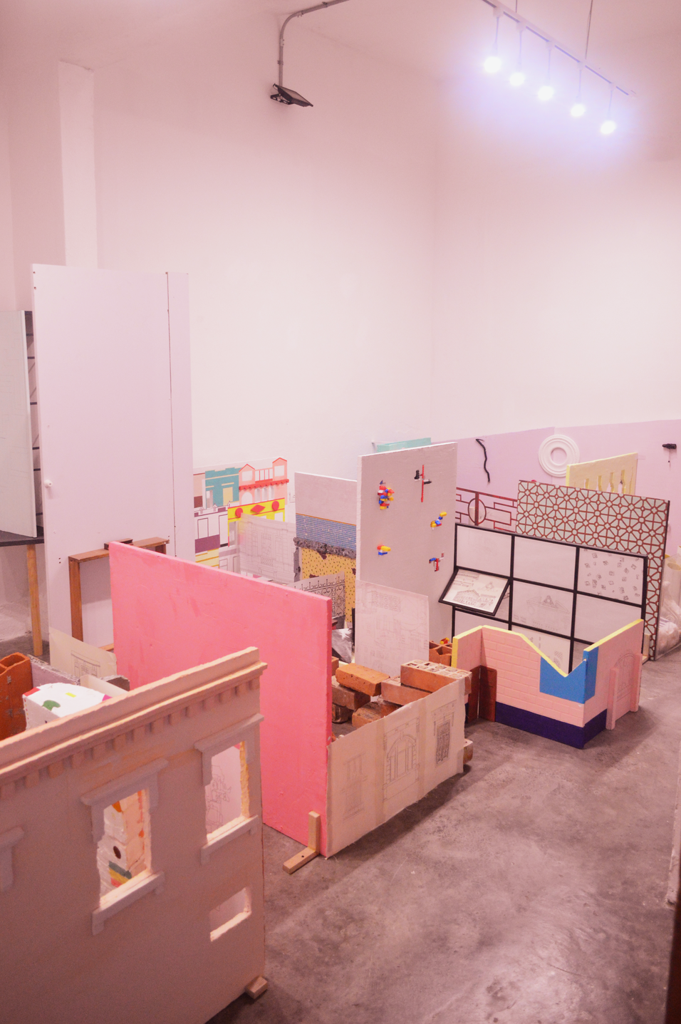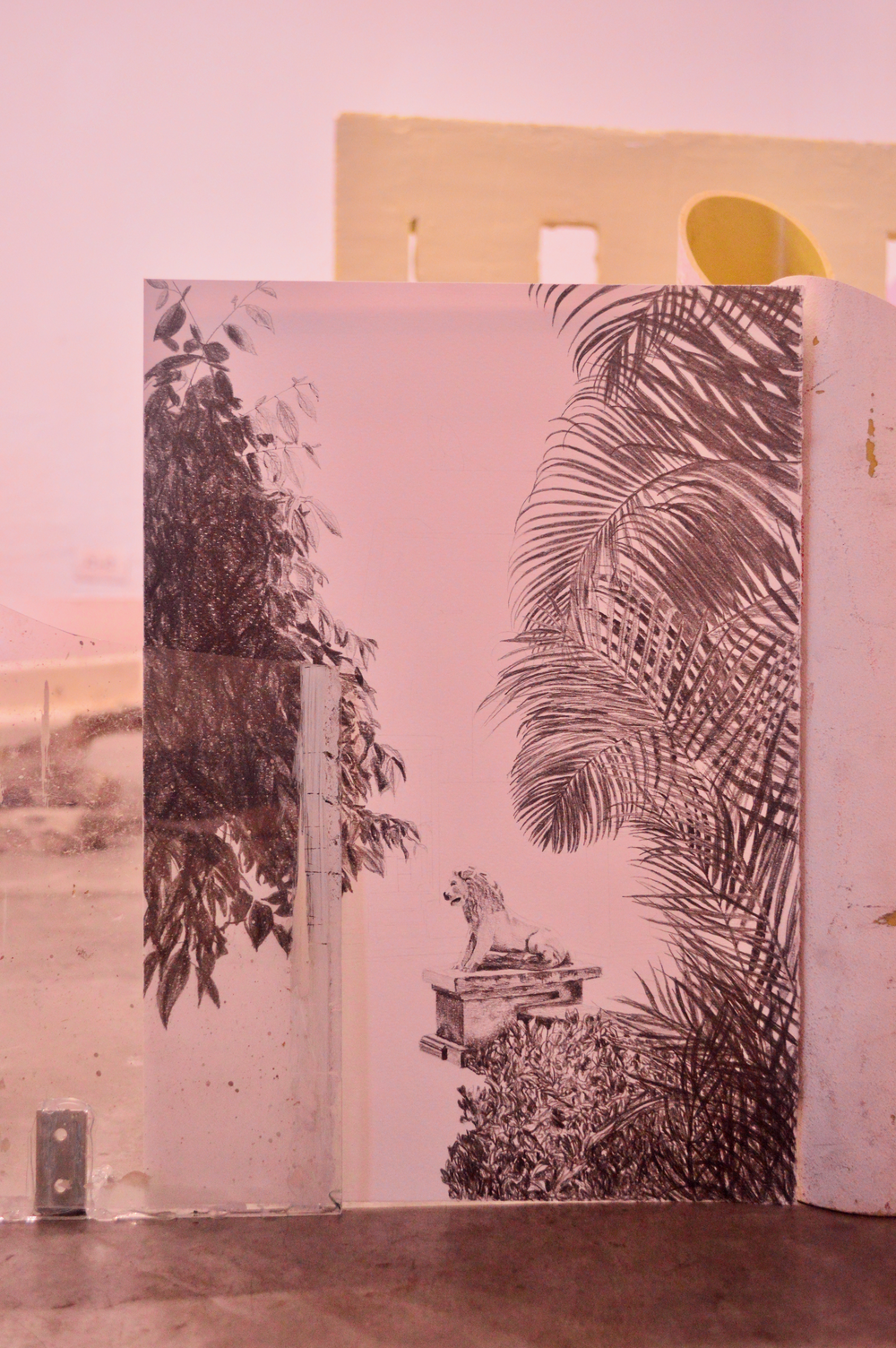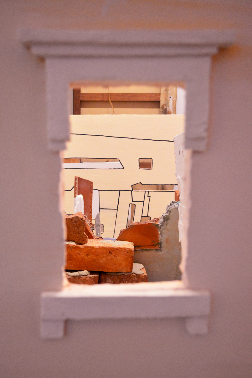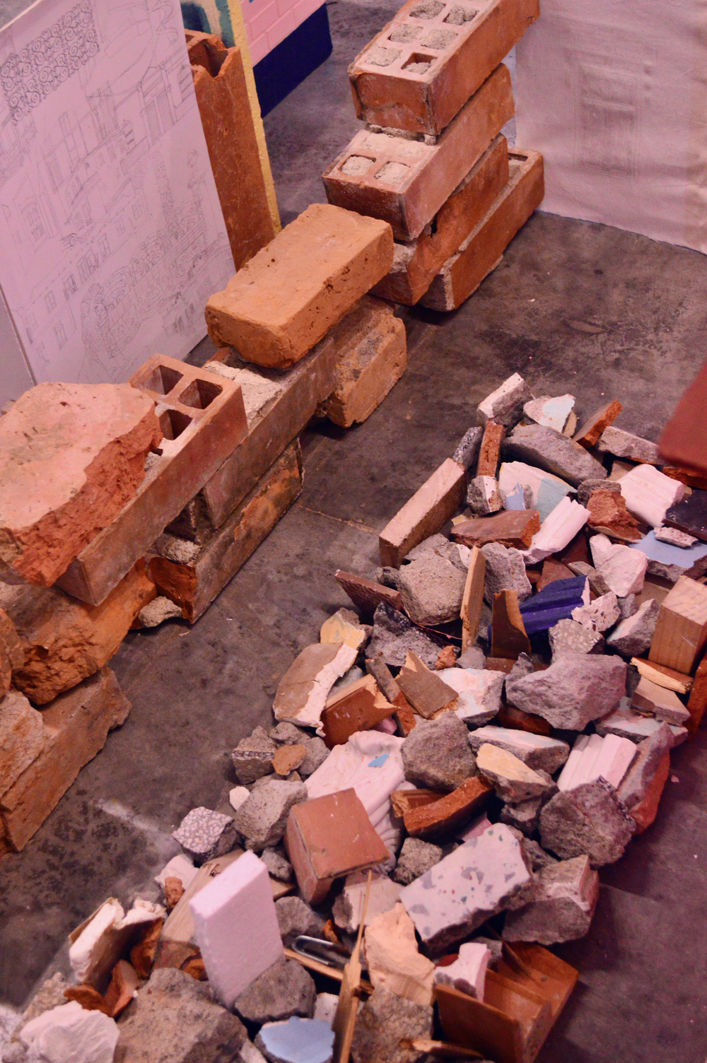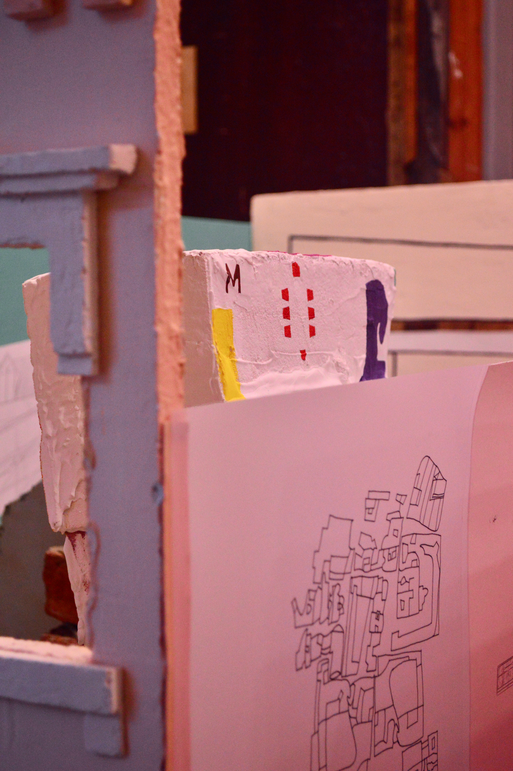 El ejercicio propuesto, dibujar la ciudad, recorrer la urbe como modelo, plantea un particular concepto de dibujo que copia, calca, refleja, trasluce, traza, truca, cae y vuelve a rayar, sobre un desfile de papelillos. Y en cualquier momento el dibujo se disfraza de estructura, cerramiento, detalle o, incluso, de capricho; el dibujo está aquí y allá, aparece y desaparece, el dibujo es encantología que se disuelve en escombro, que a su vez, mediante este mismo procedimiento, se materializa en espectro. La piedra y el papel construyen sueños que en la vida diurna se representan como fachadas vacías interceptadas por la sinuosidad de telares verdes que ondean como banderas de un territorio que nos invita y nos repela.